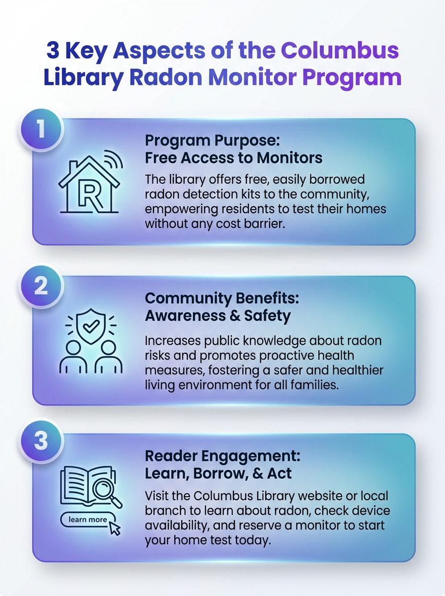 | What is the Columbus Library Radon Monitor Program? | A partnership that lets Columbus Metropolitan Library cardholders borrow continuous radon monitors for free to test their homes, similar to how they borrow books, as described in our full Columbus Library radon testing guide. |