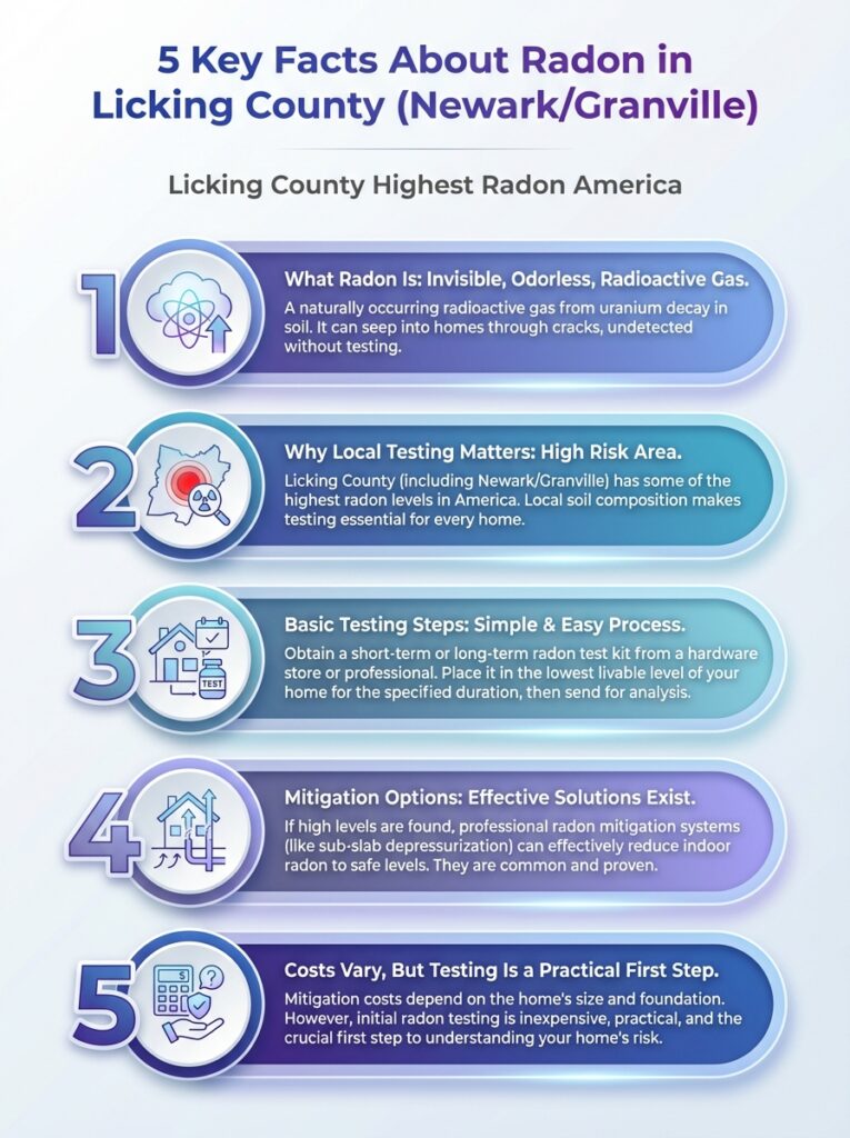 This infographic highlights five key facts about radon in Licking County, including Newark and Granville. Learn what these findings mean for home safety and testing.