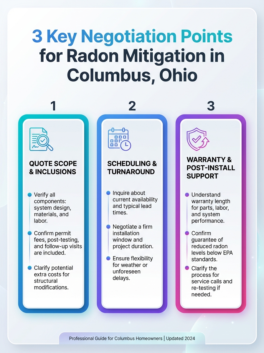 Three essential negotiation points for radon mitigation in Columbus, Ohio. This infographic assists homeowners in negotiating with radon remediation contractors.
