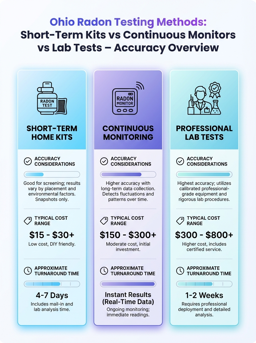 This infographic compares the accuracy of Ohio radon testing methods, highlighting short-term kits, continuous monitors, and lab tests. It helps readers interpret radon test results and choose the right approach.