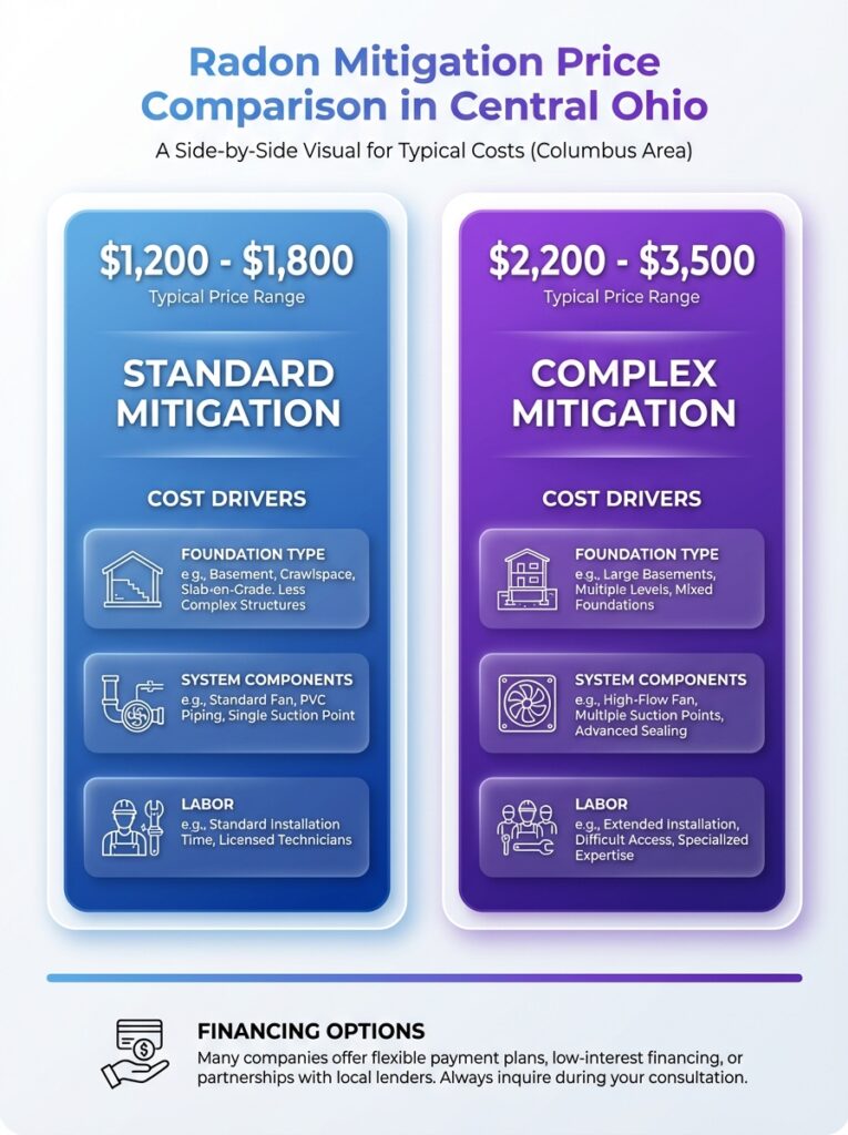 | What is a fair price for radon mitigation in Columbus? | Most Columbus homeowners pay between $1,200 and $2,500 for professional mitigation, with many standard systems around $1,200–$1,800. See our detailed breakdown at radon system cost by home type. |